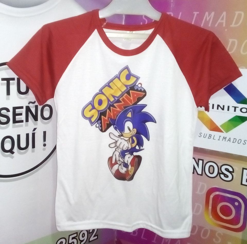 Remera de poliester raglan niños color blanca con mangas rojas talle 12 con diseño sublimado de SONIC