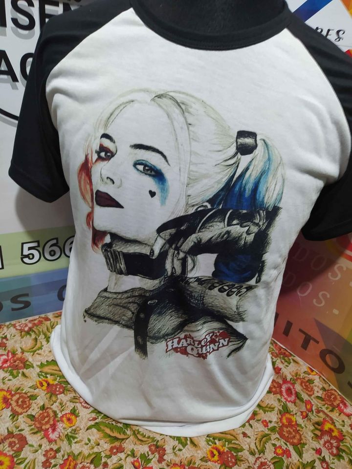 Remera raglan poliester color blanca con mangas en color negras Talle L con diseño de HALEY QUINN sublimado frente de la remera