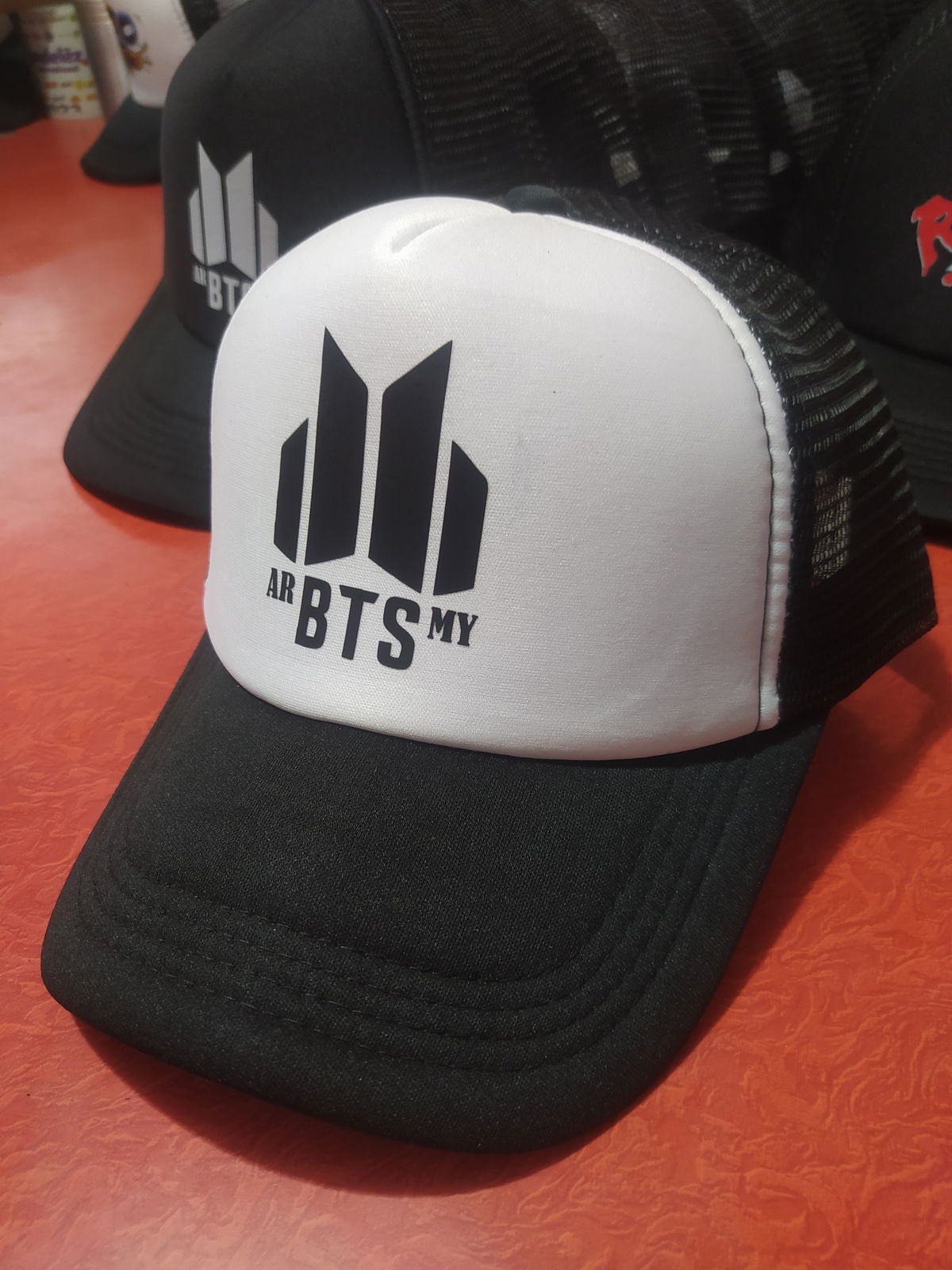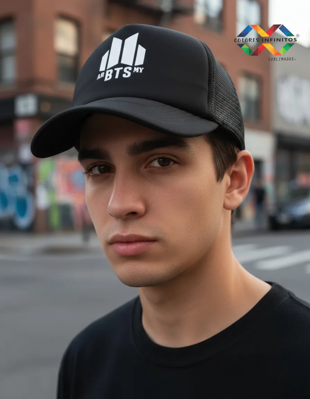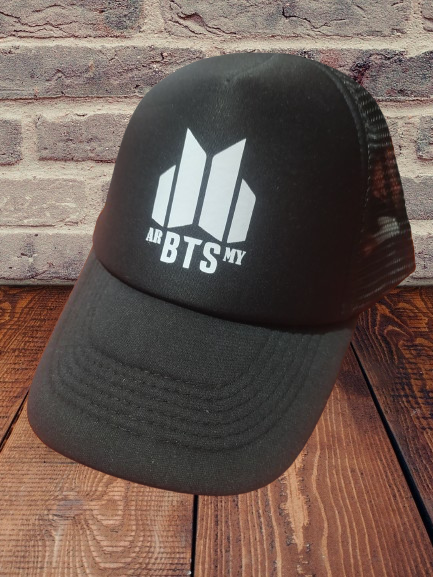 Gorra Truckers adultos color negra con pleno del mismo color con diseño de BTS en impresion DTF