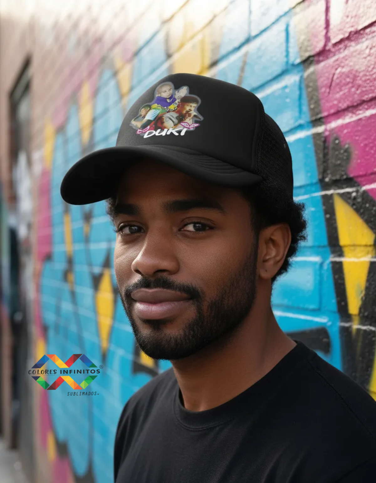 Gorra truckers adulto color Negra con pleno del mismo color con diseño estampado en impresion DTF