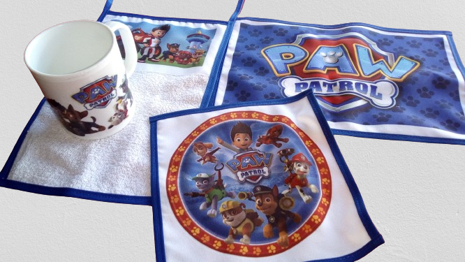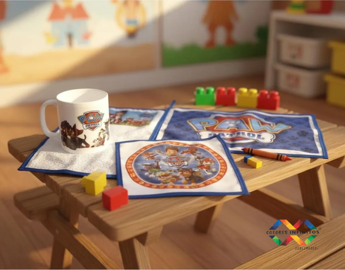 Set de jardin infantes viene con los siguientes articulos , Servilleta , individual , toalla y taza polimero ( plastico) todos estan sublimados con diseños de PAW PATROL