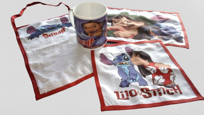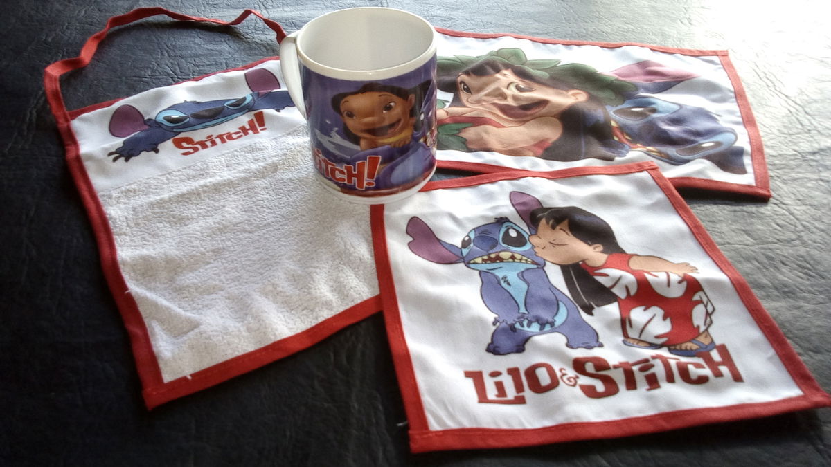 Set de jardi infantes viene con los siguientes articulo Servilleta , individual , toalla y taza de polimero ( plastico ) todos estan sublimados con diseño de STITCH