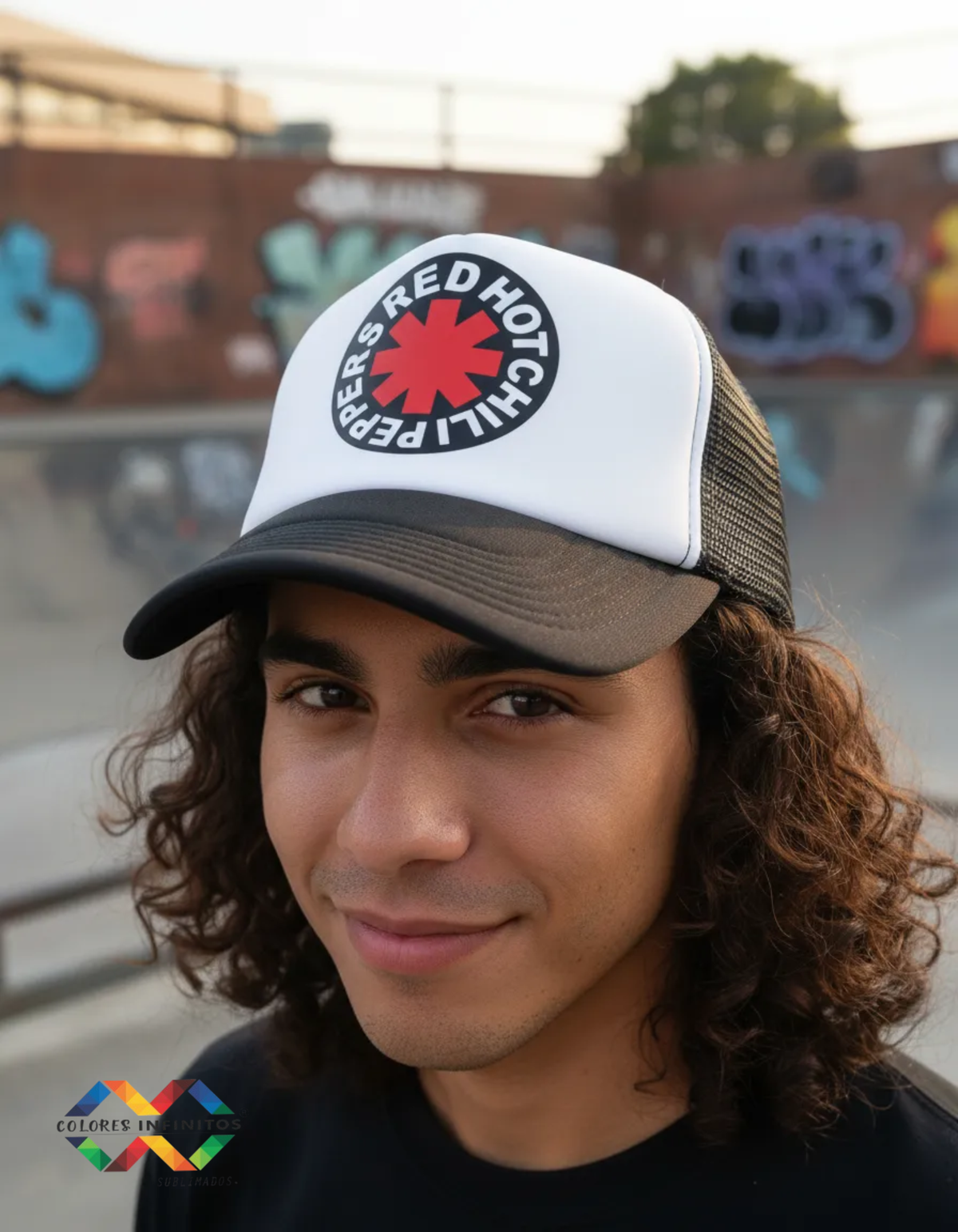 Gorra truckers color negra con pleno blanco con diseño estampado en impresion DTF de RED HOT CHILI PEPPARS