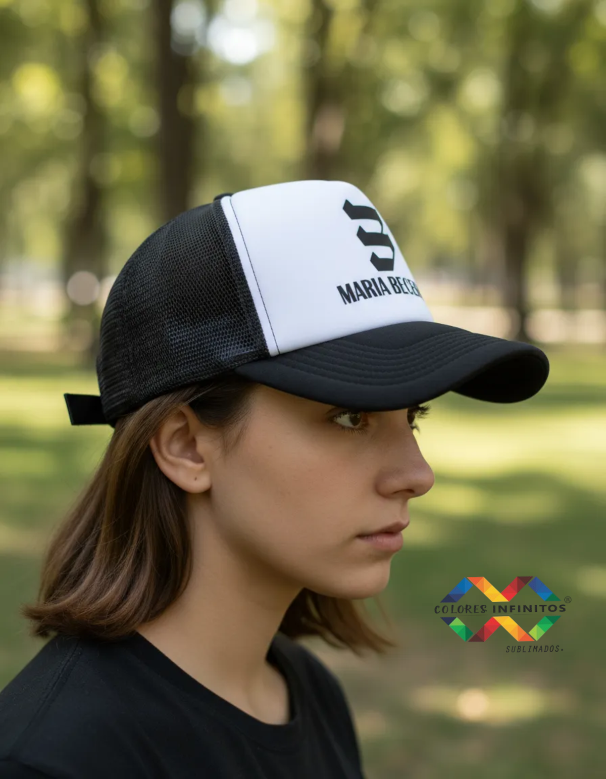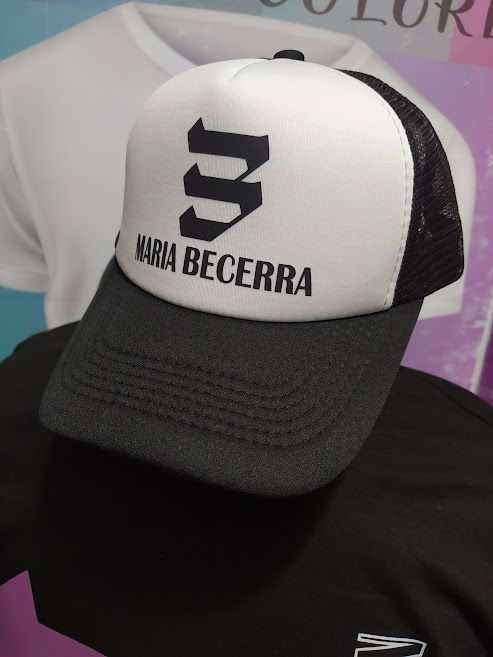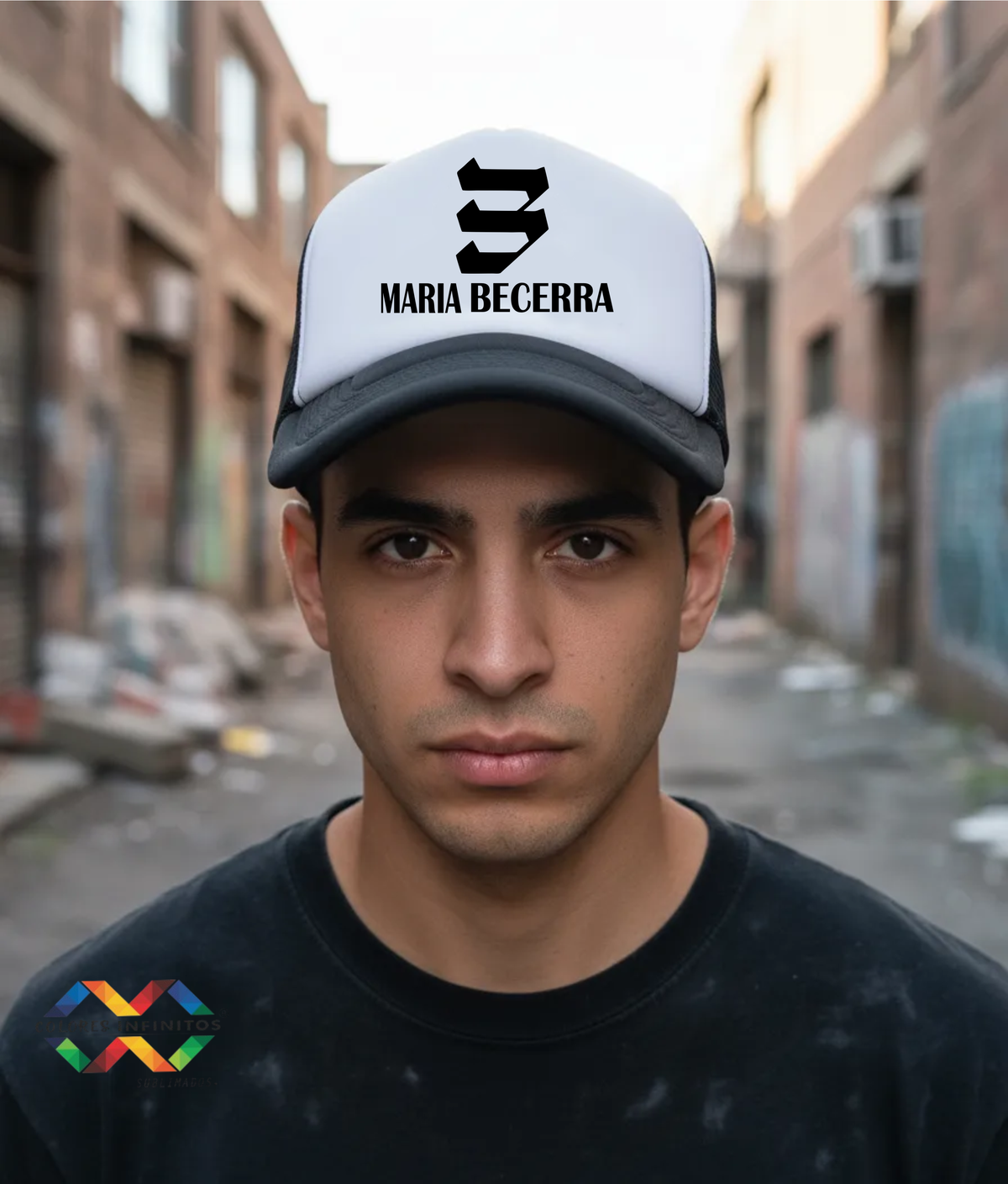 Gorra Truckers adulto color negra con pleno blanco con diseño estampado en impresión DTF de MARIA BECERRA