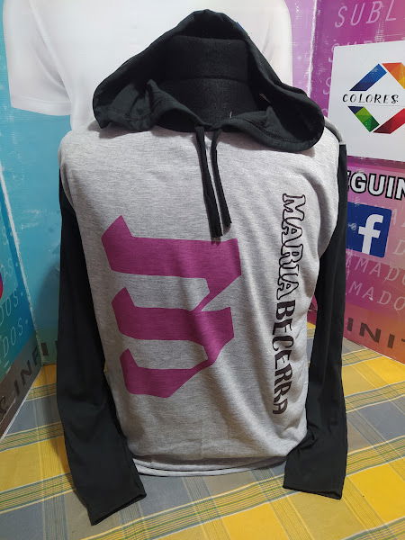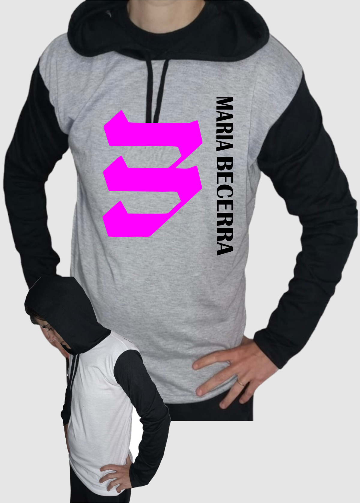 Remera poliéster color gris melange con mangas largas y capucha en color negro Talle XL ,medidas 55cm de ancho 68cm de largo con diseño sublimado de Logo María BECERRA