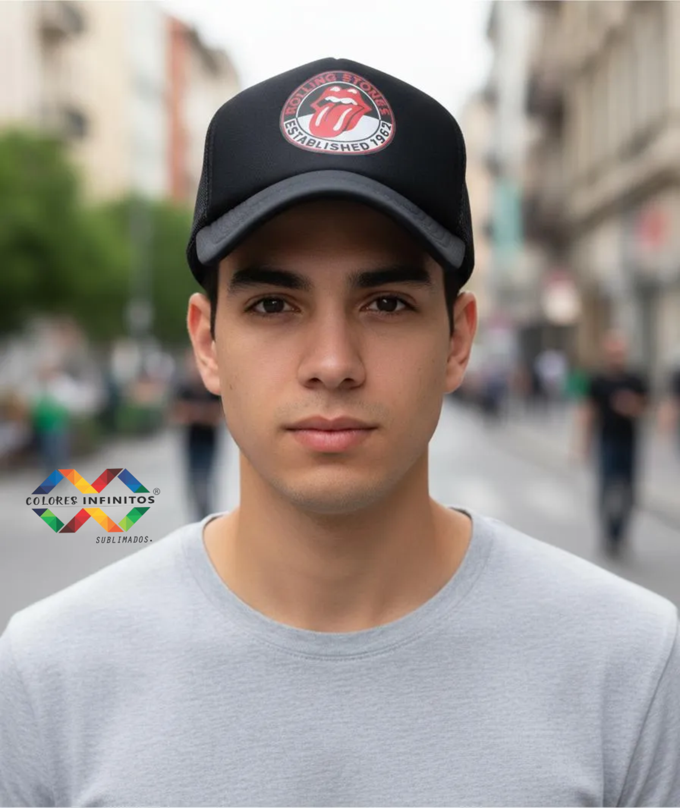 Gorra truckers adultos color negra con pleno del mismo color con diseño estampado en impresion DTF de THE ROLLINS STONE